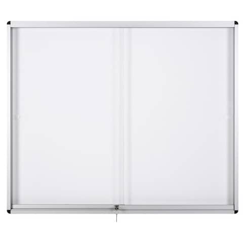 Bacheca in alluminio con ante scorrevoli. Soluzione elegante per l’esposizione delle informazioni. Resistente e durevole. Superficie magnetica in acciaio laccato. Sistema ad ante scorrevoli, ideale per i corridoi e gli spazi ristretti. Vetro rinforzato da 5mm per maggiore sicurezza. Profondità interna utilizzabile: 55mm; Profondità totale: 75mm. Può essere chiusa a chiave; in dotazione con 2 chiavi.
