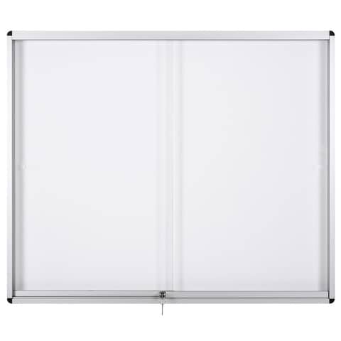 Bacheca in alluminio con ante scorrevoli. Soluzione elegante per l’esposizione delle informazioni. Resistente e durevole. Superficie magnetica in acciaio laccato. Sistema ad ante scorrevoli, ideale per i corridoi e gli spazi ristretti. Vetro rinforzato da 5mm per maggiore sicurezza. Profondità interna utilizzabile: 55mm; Profondità totale: 75mm Può essere chiusa a chiave; in dotazione con 2 chiavi.