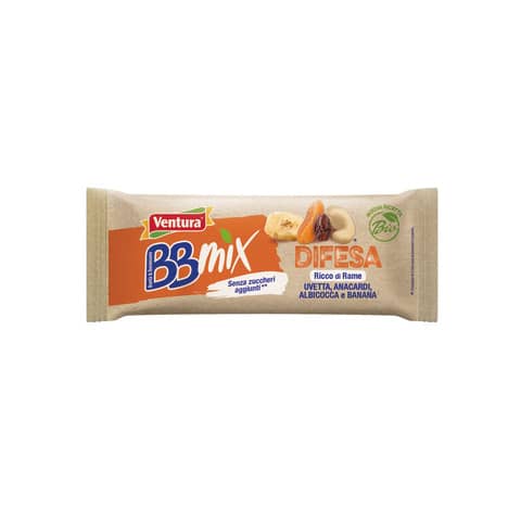 Barretta biologica di frutta secca ed essicata Difesa BB Mix. Confezione da 24×30 gr. Ingredienti: datteri, uva, anacardi sgusciati, albicocche, bnana, aroma arancia, reishi in polvere. Senza zuccheri aggiunti.
