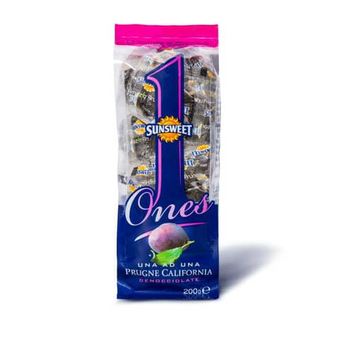 Prugne essicate denocciolate Ones. Confezone da 10×200 gr. Ingredienti: prugne secche (sunsweet pitted, classe 1).